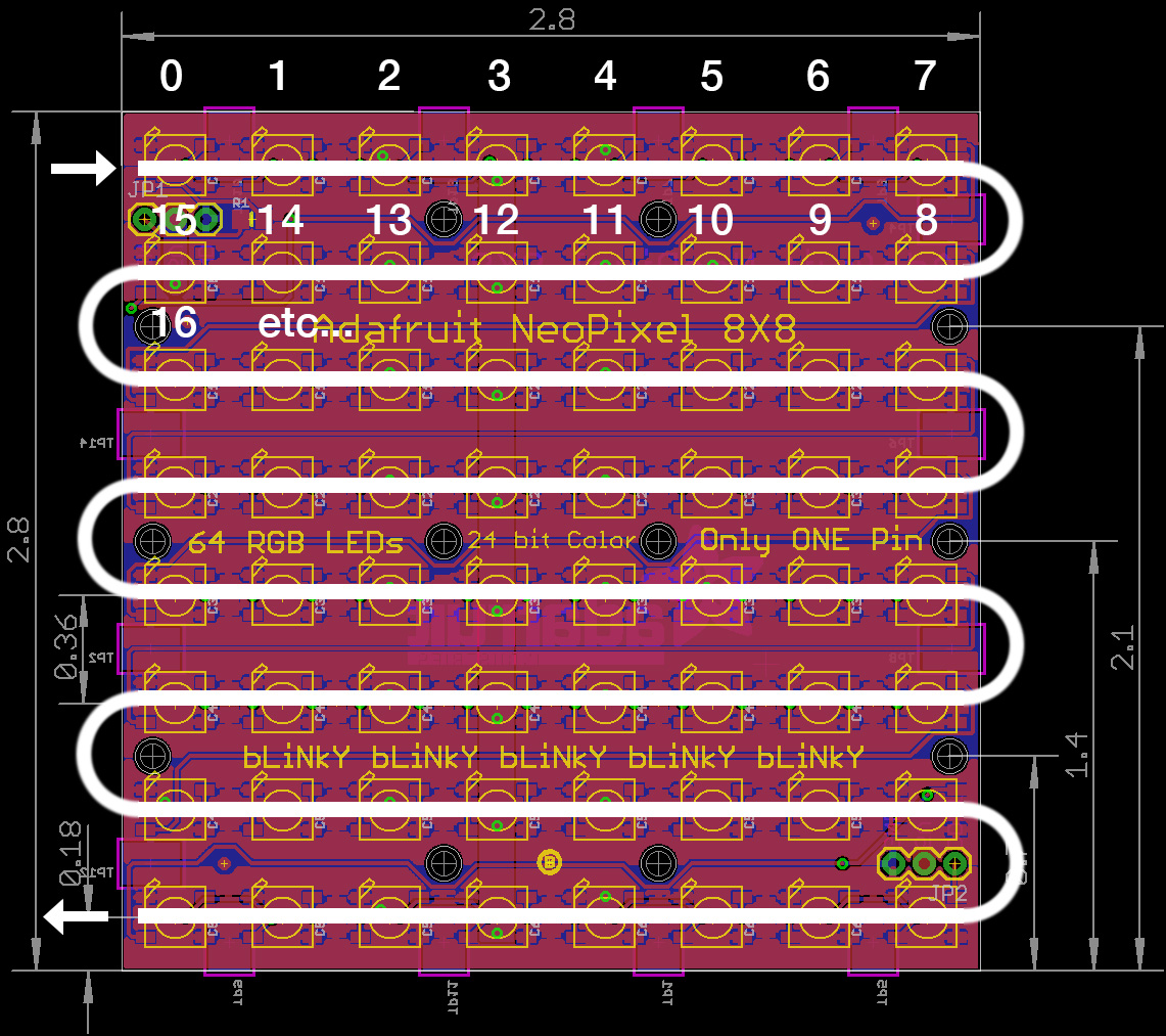 I'd made the assumption during my wiring stage that my horizontal layout could simply be rotated in the Processing sketch or OPC layer to be vertically oriented and wrapped around a cylinder. Here's an example of the indexing of the zigzag array I'd followed [this example matches an 8x8 NeoPixel grid but the result is similar for a 15x8 grid - just longer on one side]:
