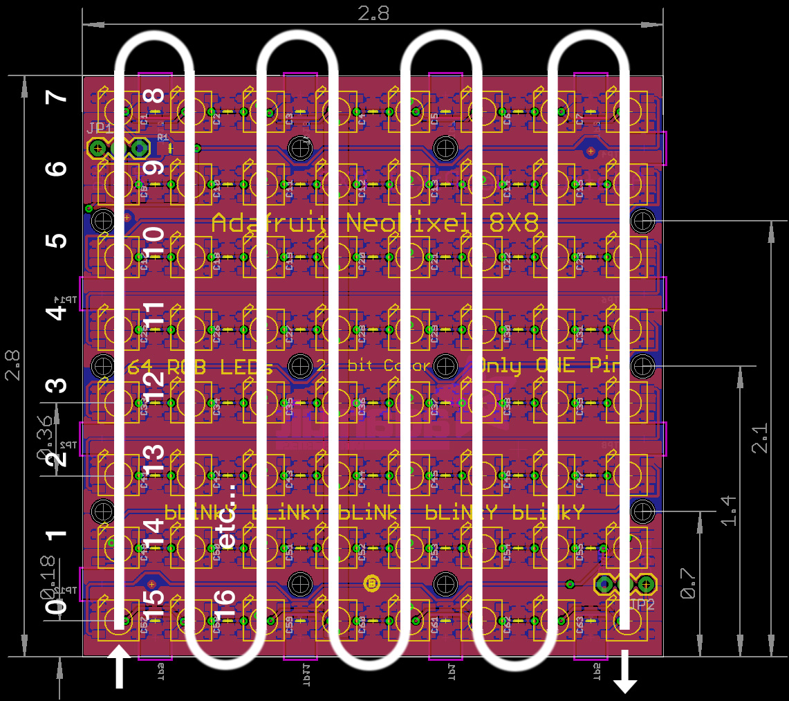 It's vitally important that the Fadecandy understands the intention of this layout so that it knows how to take the sample points in the processing sketch and convert the resulting pixel colour information into the correct spatial information when it's sent in serial down the data pin connection of the LED strip.