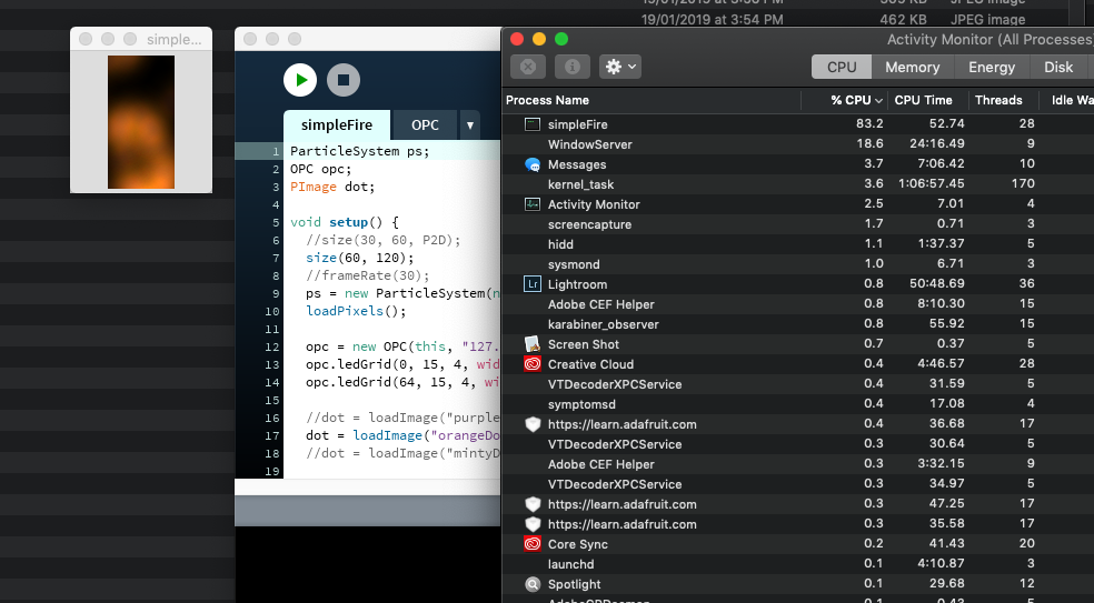 | Even after shrinking and optimisation, my Simple Fire sketch can consume 83.2% CPU on the Mac Mini at 30fps. |