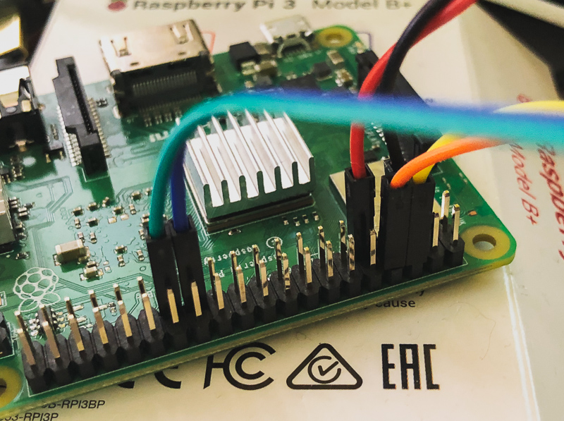 | GPIO pins on my Pi with two switches and a status LED connected. |