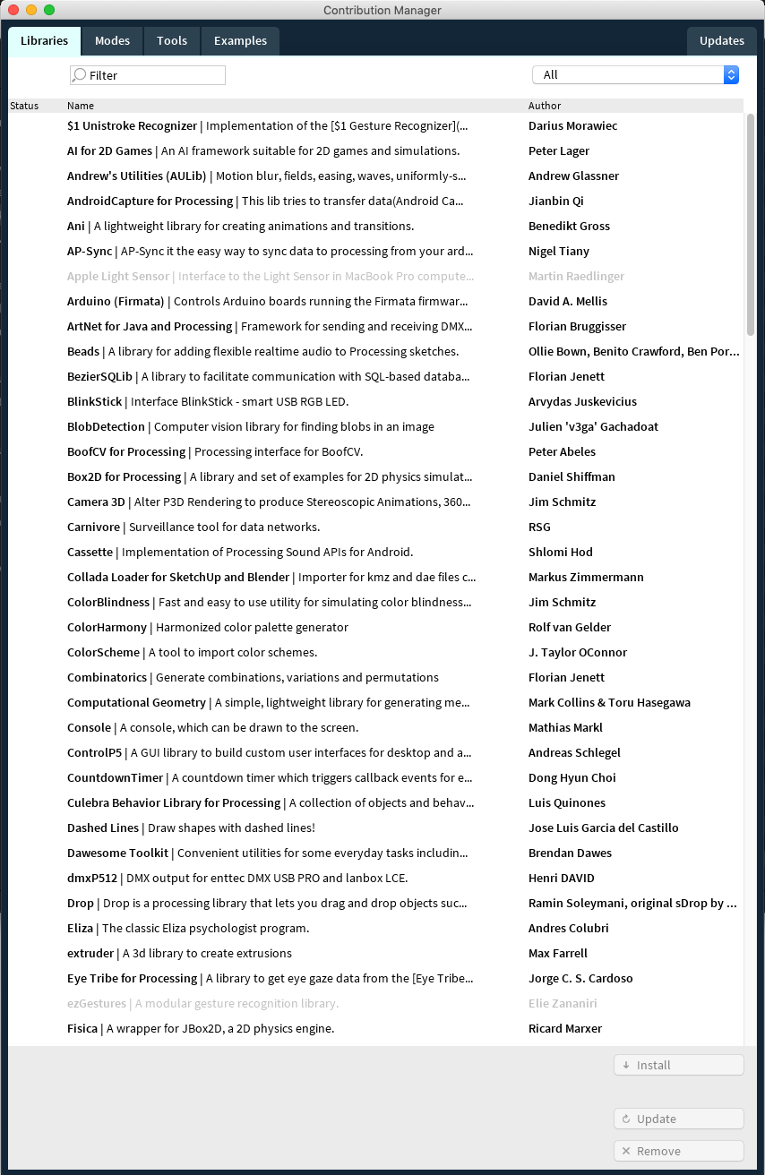 Processing also ships with an excellent library browsing and installation tool that gives you instant access to a wide variety of tools to do everything from sound interaction to computational fluid dynamics: