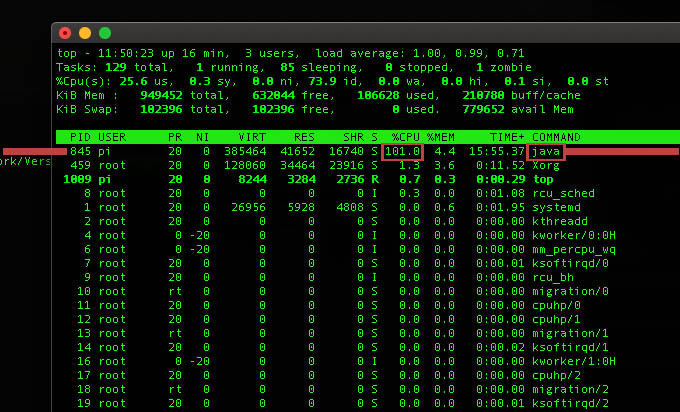 By using the good old 'top' command while a pre-compiled sketch is running, I could see at a glance that the main CPU hog is java and also that there were no other java processes currently occurring. This mean that to stop my sketch immediately I can simply execute the 'killall java' command to nuke it. This is a bit like using a hammer to squash a fly I realise, but as this Pi was simply devoted to being my lavalamp and shouldn't be running any other java processes, it's fine to use this method.
