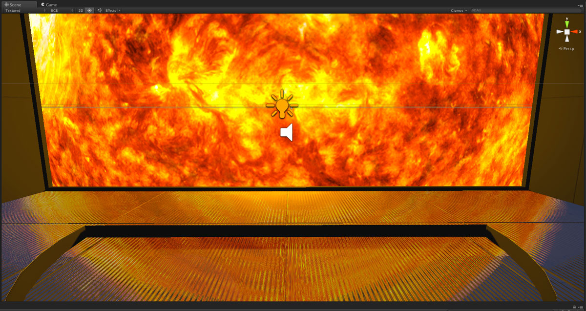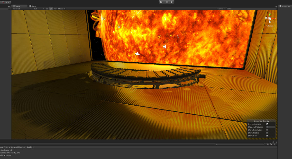 I discovered that Unity can make these rather easily internally too. By choosing a transform internally near where the viewer would be situated I can render 6 x 90° camera projections that form a box with the images that everything inside that box that was shiny would see. This is great. Now my normal-mapped floor can reflect the sun! Now my own cubic reflection map looks more like this: