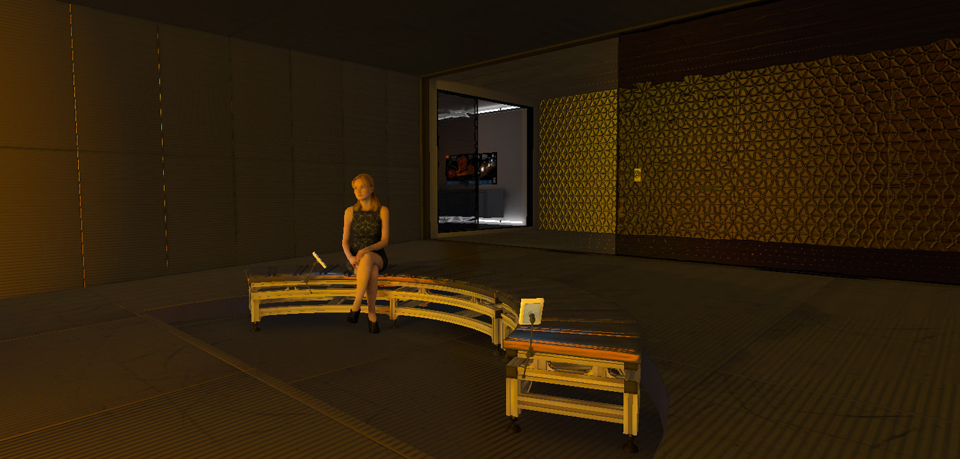| I found a free, high-quality model of a seated woman online to share the viewing couch. |