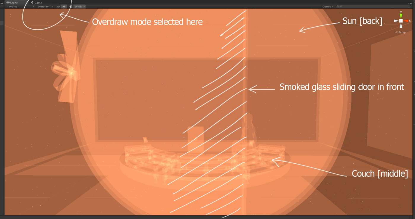 To draw the current frame, the GPU usually attempts to draw the objects in the scene from the furthest object visible all the way up towards the front, or what is nearest to the camera. This is good because objects are sort of stacked logically and things appear in the correct order depth-wise, but this is also bad because things that might be hidden by other things are drawn unnecessarily, wasting GPU resources. This is the first problem. This unnecessary drawing is called 'overdraw' and in fact Unity has a viewport mode dedicated to showing you what's hiding behind other things:
