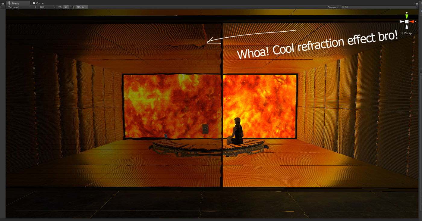 Oh noes!!! The horror! I resigned myself to the fact that I probably couldn't afford this cool looking effect with my GPU [nVidia GTX 680MX] and swapped the Pro refraction shader for a plain alpha-mapped transparency shader. So sad. However, I remembered that for achieving a sense of presence, Oculus recommend a high frame rate over visual fidelity.