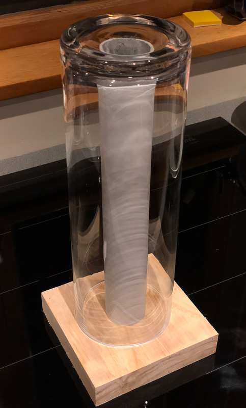 I should mention at this point that I'd decided on the length of the strips according to the final form I intended to deploy the strips into. I wanted to mimic the Ion lamp styling and presumptuously assumed a local homeware shop [Briscoes] would simply have cylindrical glass vases that might suit the task. They did! Here's a pic of the vase, upside down on a temporary wooden plate with a central core of PVC tube from the hardware shop: