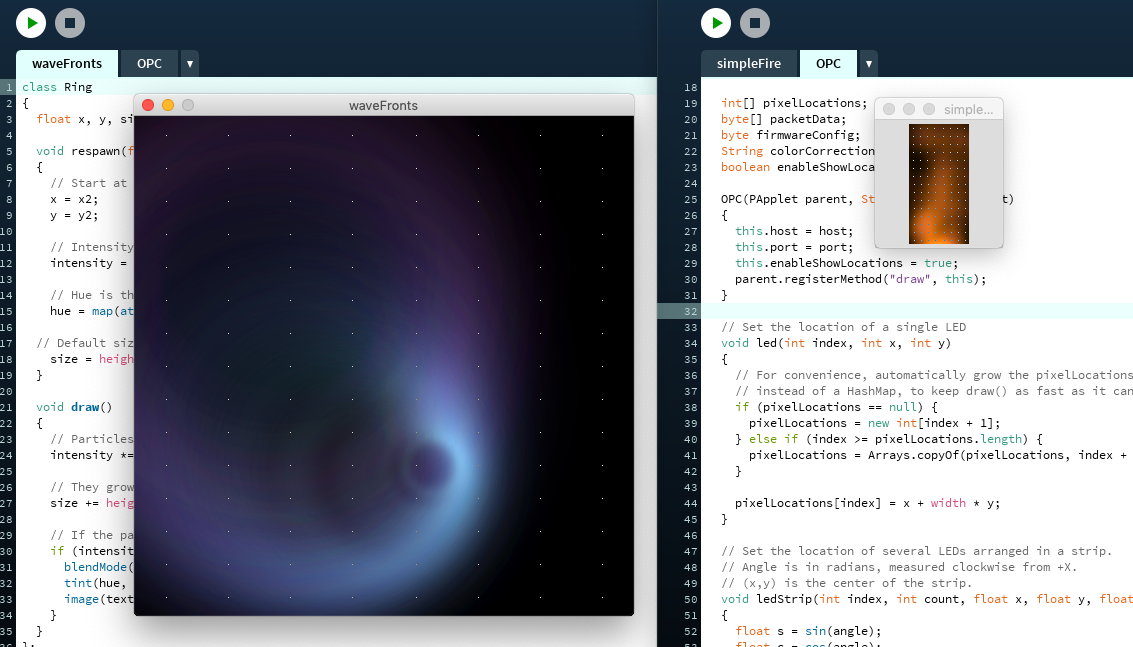 How does Processing interface with the FadeCandy server though? How do you even know what is being sent to your LED array from your sketch? Good question. This is where the OPC class comes in.
