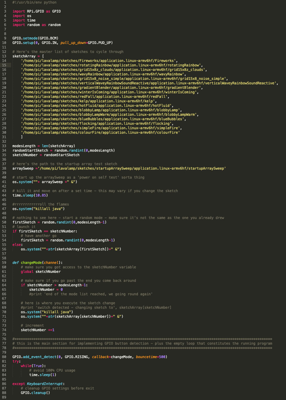 This link also includes the instructions for getting this small python script to run when the system starts up automatically. This is really handy and I thought I could simply reuse this script launching facility to start the python script that would listen for my second button pushes to make the lavalamp sketch change. However, this was not to be - more on that shortly.