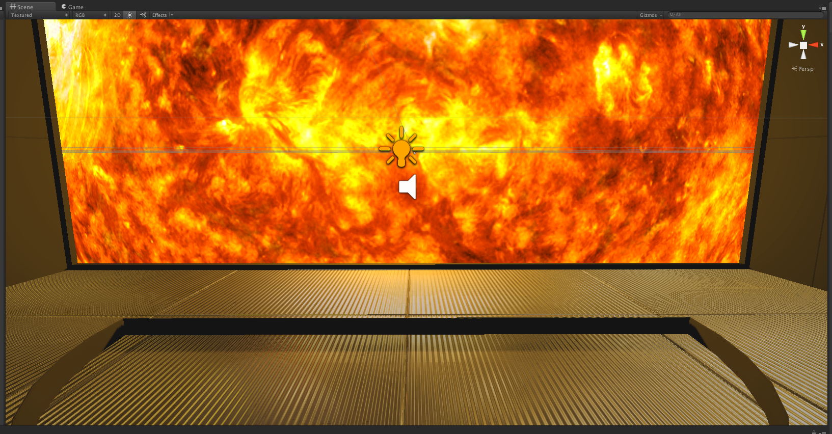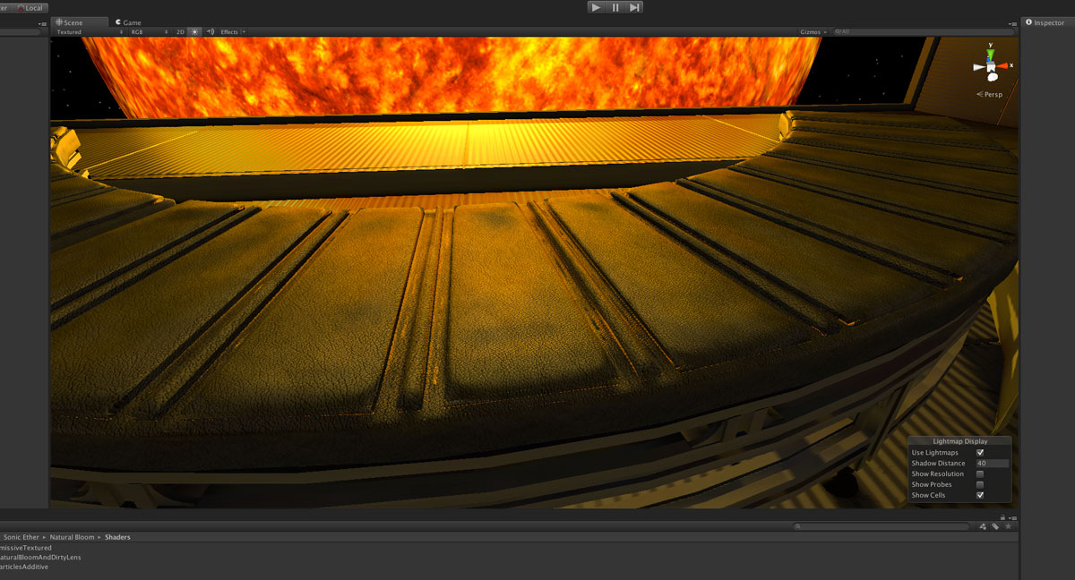 I discovered that Unity can make these rather easily internally too. By choosing a transform internally near where the viewer would be situated I can render 6 x 90° camera projections that form a box with the images that everything inside that box that was shiny would see. This is great. Now my normal-mapped floor can reflect the sun! Now my own cubic reflection map looks more like this: